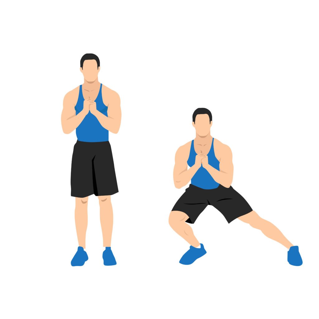 Mouvement latéral :Faites un grand pas sur le côté avec une jambe tout en gardant l’autre jambe tendue.Pliez le genou de la jambe qui se déplace pour abaisser vos hanches vers l’arrière, comme si vous alliez vous asseoir sur une chaise.